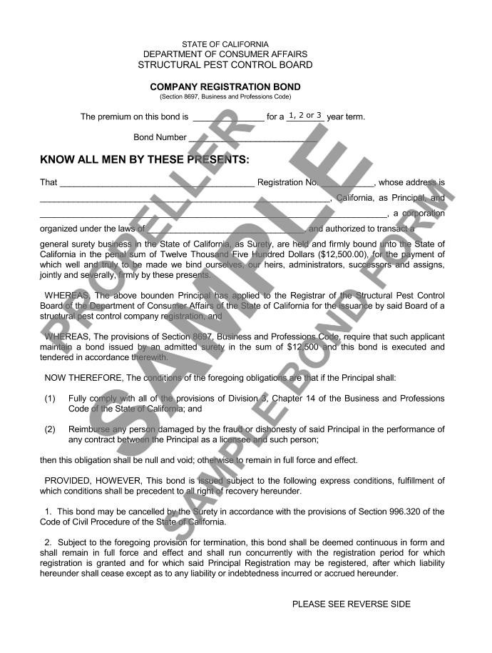 Required by the California Structural Pest Control Board for company registration under the Structural Pest Control Act.