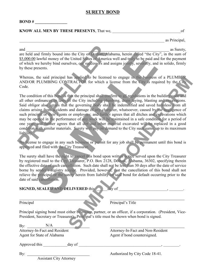 Alabama Dothan Plumbing Contractor Bond - $5,000