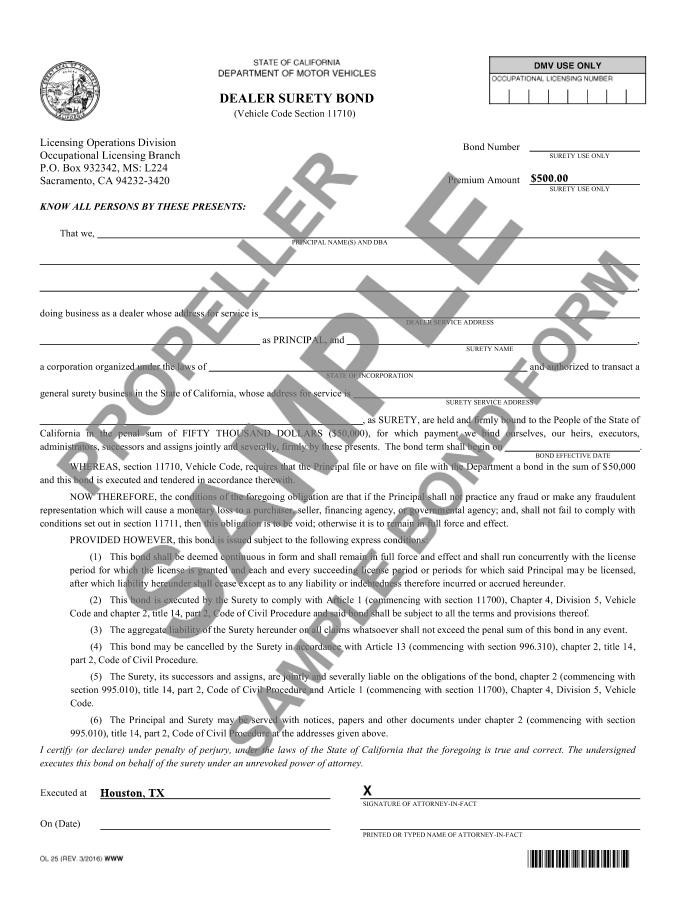 auto dealer bond, California, vehicle dealer, DMV, license bond