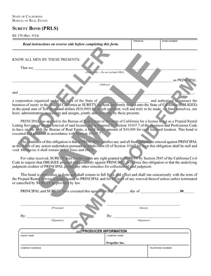 Required by the California Department of Real Estate for prepaid rental listing services. $10,000 bond per location to protect consumers.