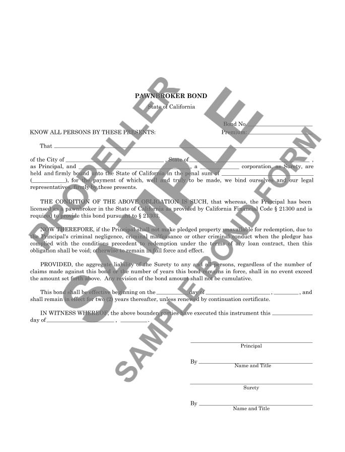 Required by local law enforcement licensing authorities for pawnbrokers in California. Secures compliance with state pawnbroker laws.